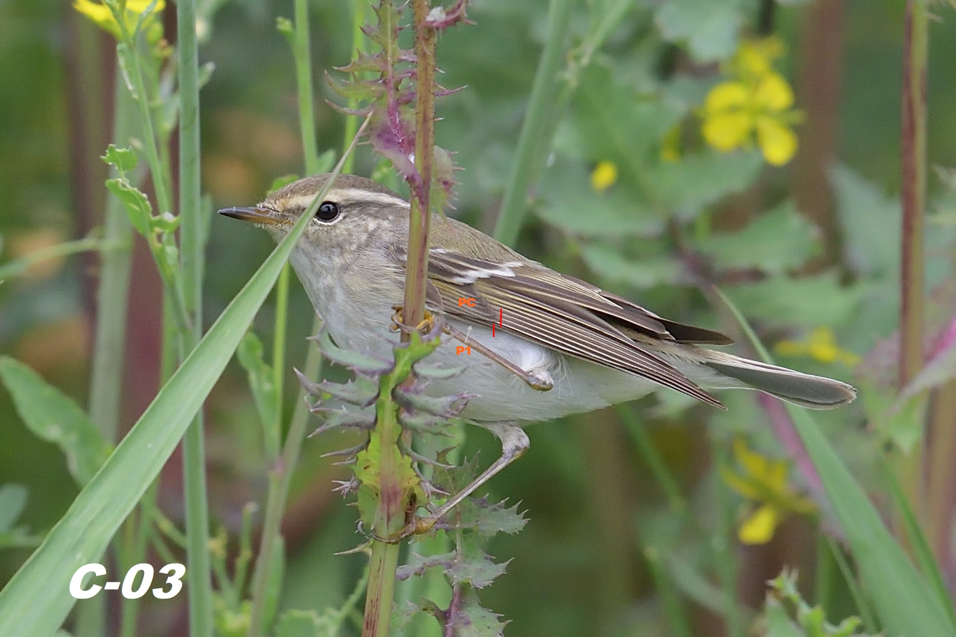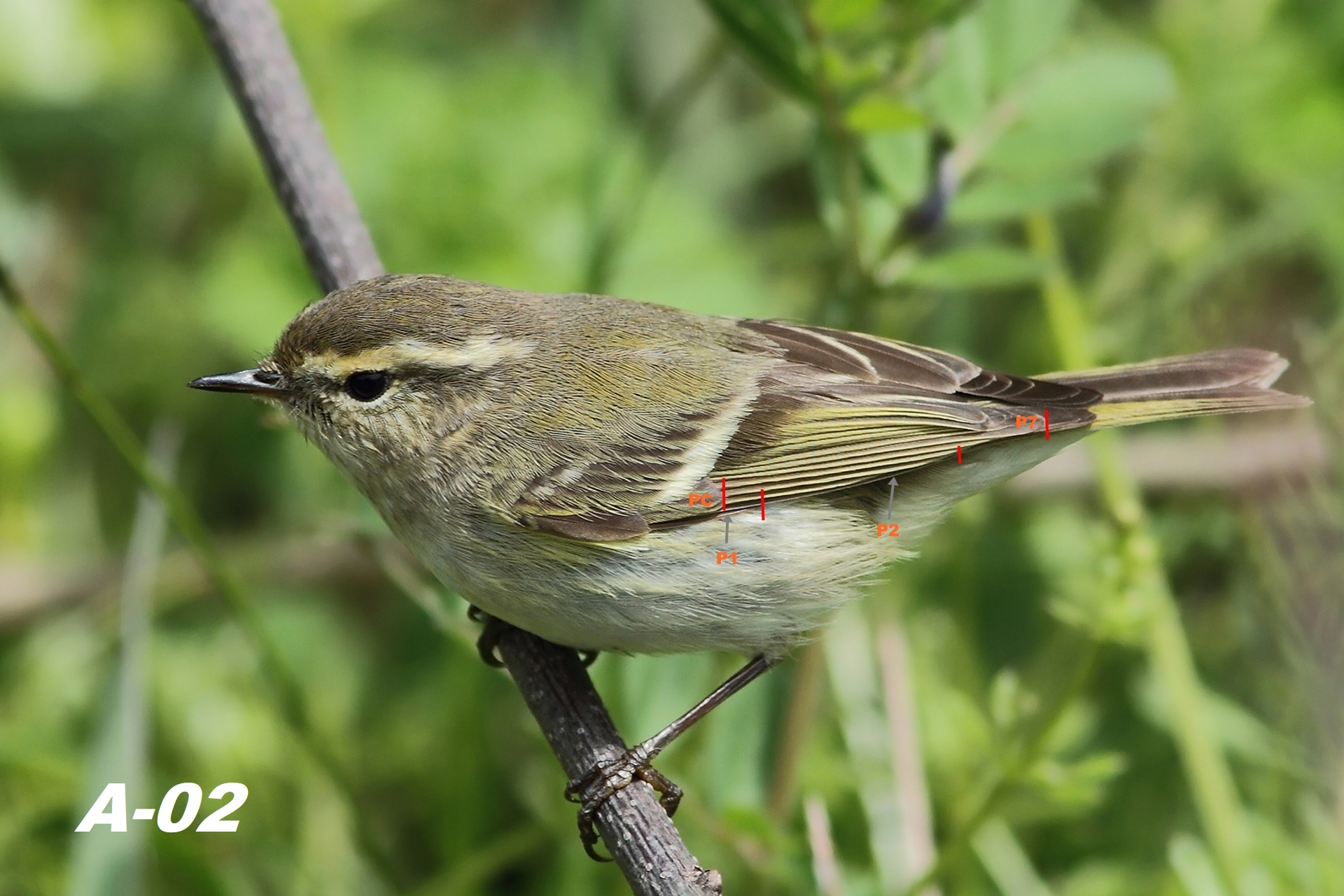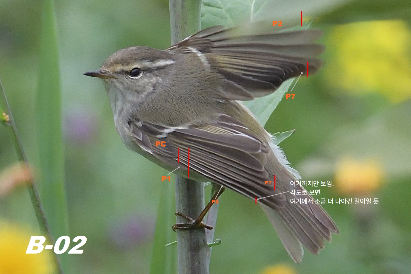 P1은 PC에 비해 그리 길지 않고, P2는 P7과 비슷하거나 살짝 짧아 보인다. 이 상태에서 정확한 익식을 파악하고 종의 특성을 찾아내는 건 무리라 생각되지만, A 그룹의 개체들에 비해 P1의 길이가 짧아 보이는 점은 노랑눈썹솔새의 특징으로 보인다.