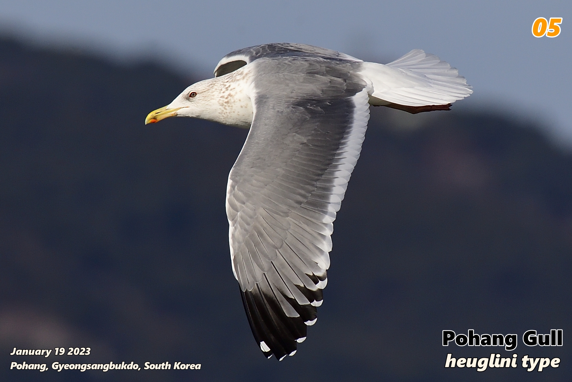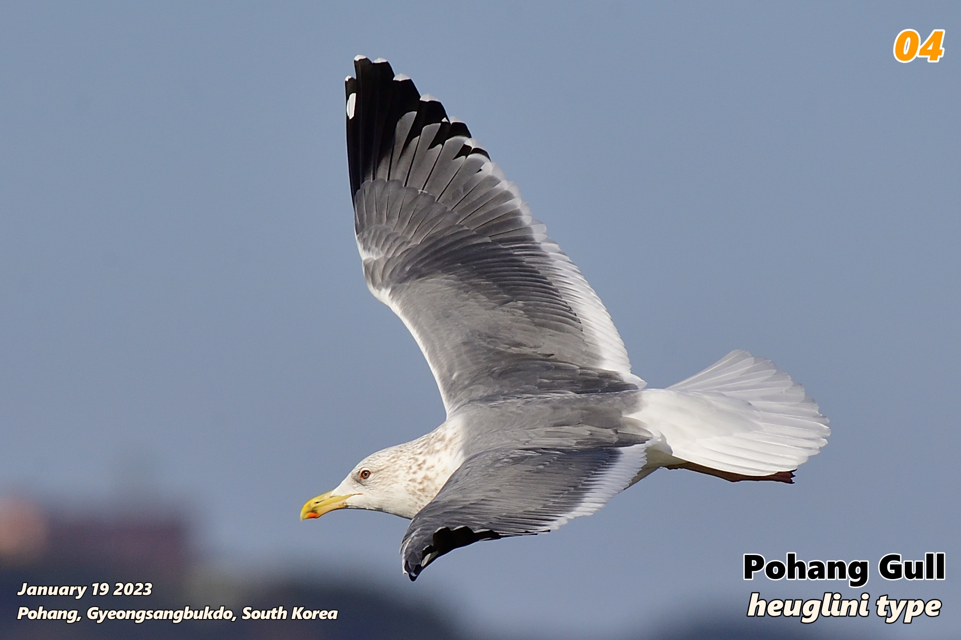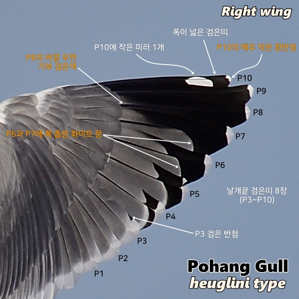 • P8~P10의 기부에 검은색이 많이 나타나고 있다. 특히 P8의 바깥 우면은 기부까지 검은색을 보이고 있고, 그레이 텅이 꽤 작아 보인다. heuglini는 첫째날개가 제일 어둡고, 검은색의 범위가 넓다. 특히 바깥쪽 첫째날개(P8~P10)에서 검은색을 많이 보이고, P8 바깥 우면 기부가 검은색인 경우가 많은데, 포항 갈매기도 그렇다. ←heuglini 특성