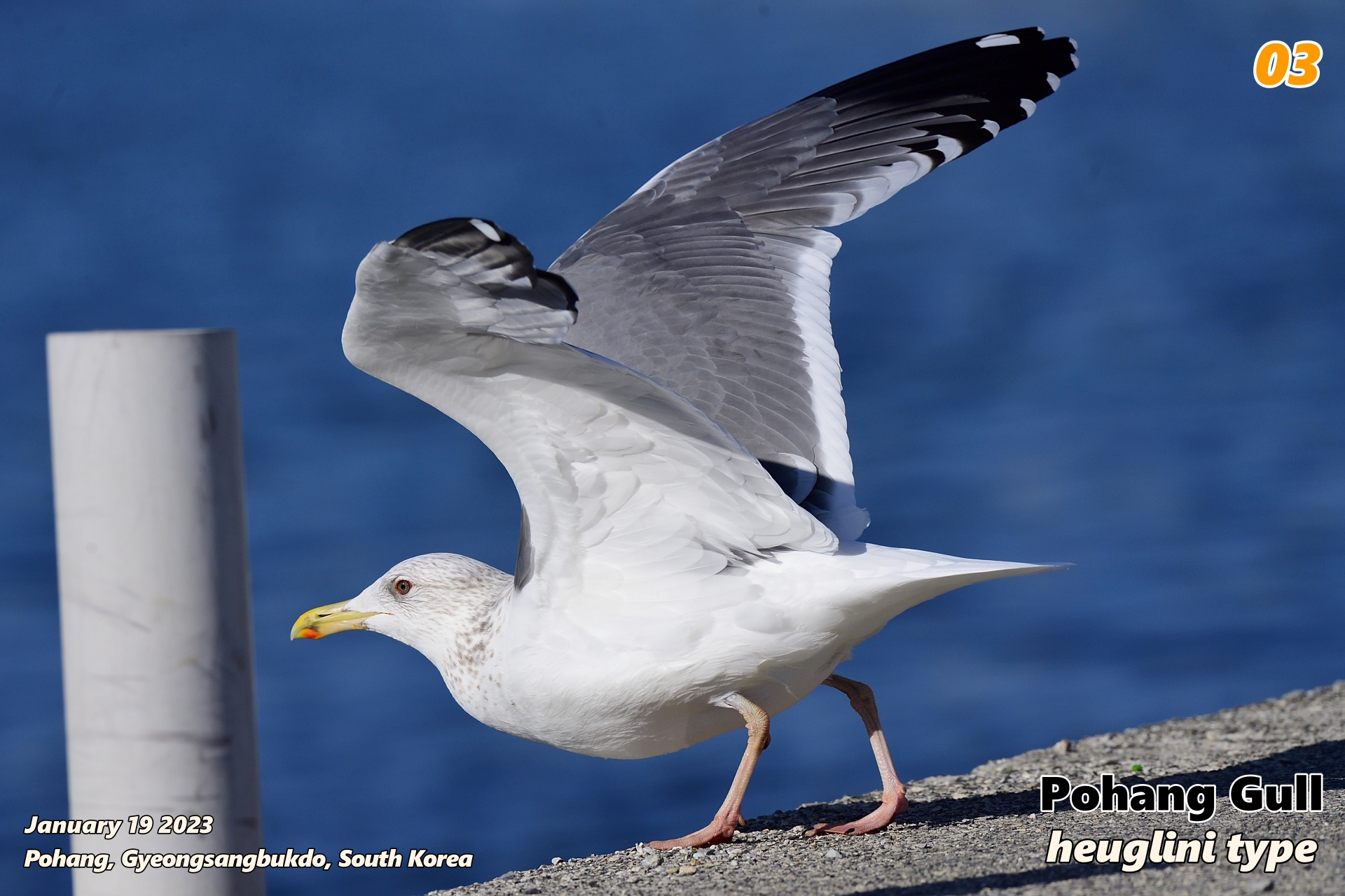 • P8에 화이트 문이 나타나지 않고, P6~P7에 매우 가늘게 화이트 문이 나타나고 있다. vegae는 P5~P8에 화이트 문이 먀우 강해서 '진주 목걸이(string of pearls)'를 형성하고, taimyrensis는 새로 깃갈이한 첫째날개 P5~P8에서 vegae만큼은 아니지만 꽤 명확한 화이트 문을 보여준다. 이와 달리 heuglini는 새로 깃갈이한 깃에서도 폭이 매우 좁은 화이트 문을 보여준다. 포항 갈매기의 P6~P7의 화이트 문은 heuglini의 전형적인 패턴과 일치하는 것으로 보인다. 1월에 동해에서 만난 줄무늬노랑발갈매기들(taimyrensis)은 깃갈이한 지 얼마 되지 않은 새 깃에서 꽤 폭이 넓고 선명한 화이트 문을 보여주고 있었다. ←heuglini 특성