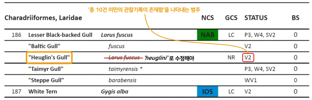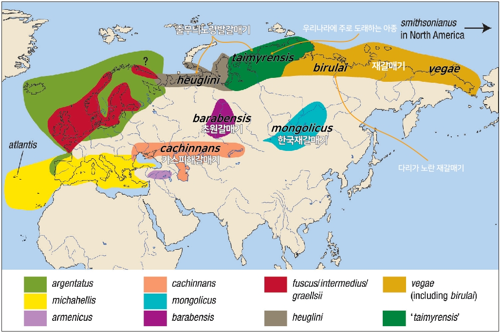 ※ 이후 Larus fuscus heuglini(Heuglin's Gull)은 'heuglini', Larus fuscus taimyrensis(Taimyr Gull, 줄무늬노랑발갈매기)는 'taimyrensis', Larus vegae vegae(Vega Gull, 재갈매기)는 'vegae'로 줄여서 사용한다.