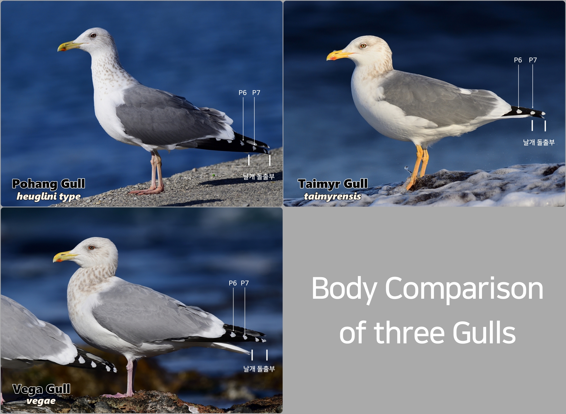 • 날개 돌출부(wing projection)에서 3 개체는 꽤 차이를 보여주고 있다. 포항 갈매기의 첫째날개는 P7이 꼬리 바깥으로 꽤 많이 돌출되어 있어서 3 개체 중 제일 길어 보인다. taimyrensis 개체는 첫째날개가 아직 다 자라지 않았다는 점을 고려하여 살펴보아야 하는데, P7이 꼬리 바깥쪽으로 살짝 돌출되어 있어서 포항 갈매기보다는 날개 돌출이 적어 보인다. vegae 개체는 첫째날개 깃갈이를 마쳤음에도 불구하고, 날개 돌출부가 짧아 보이는데 P7이 꼬리 안쪽에 위치해 있다(이 개체가 vegae 평균보다 더 짧아 보이긴 함).