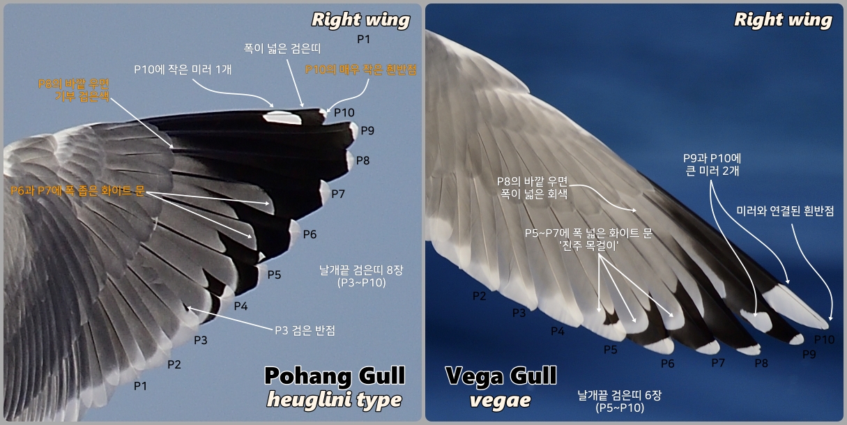 • 포항 갈매기의 P10의 날개끝 흰반점은 매우 작다. vegae 개체는 날개끝 흰반점이 미러와 연결되어 나타나고 있다.