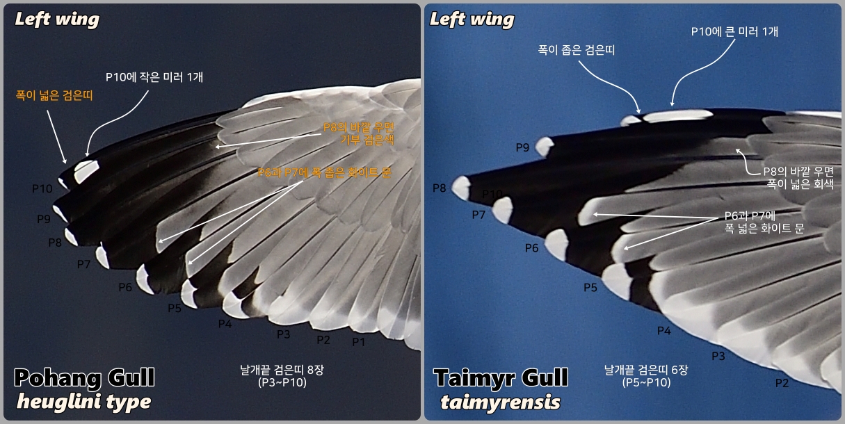 • P6과 P7에서 보이는 화이트 문의 형태는 두 개체에서 커다란 차이를 보여주고 있다. 포항 갈매기는 아주 얇은 화이트 문이 나타나고 있는 반면, taimyrensis 개체는 꽤 폭이 넓은 화이트 문을 보여주고 있다.