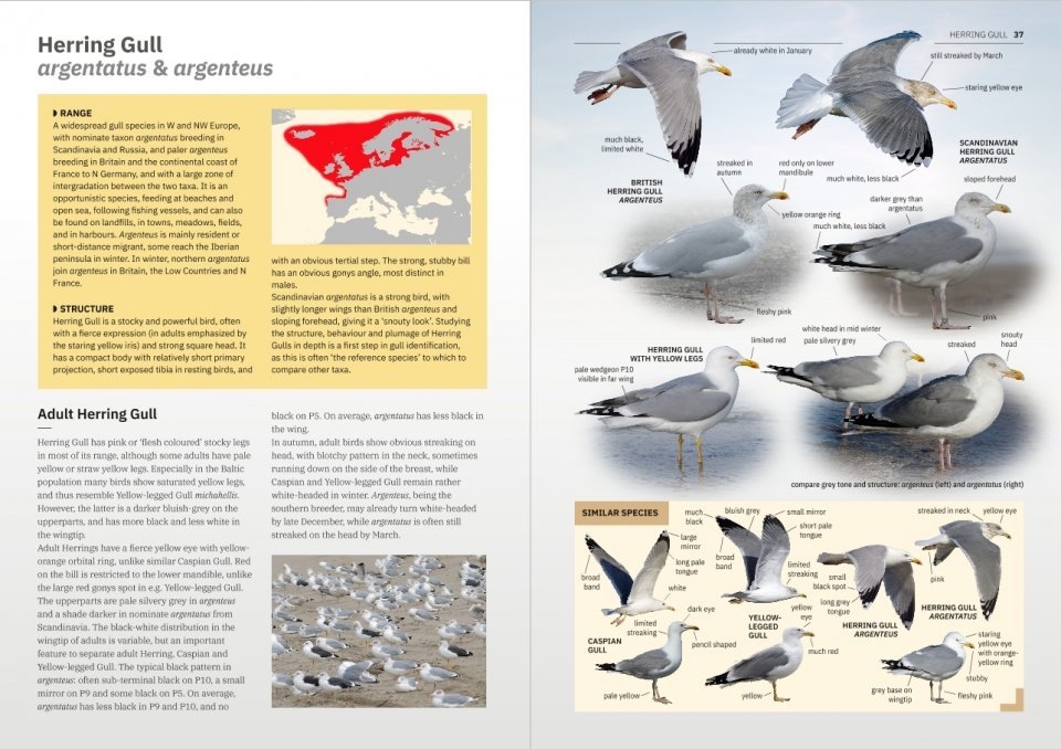 이 도감은 세상에서 갈매기를 제일 사랑하는 사람들의 연구 모임인 'Gull Research Organisation(일명 GRO)' 멤버들이 유럽, 북아프리카, 중동의 갈매기들에 대해 펴낸 갈매기 식별 도감입니다. 어려운 학술적인 내용을 배제하고, 사진들을 참 잘 활용해서 갈매기들을 직관적으로 동정할 수 있도록 도와 줍니다. 특히 모든 갈매기들을 깃갈이 주기별로 나누어 설명하고 있어서 갈매기들을 공부하려는 사람에게 아주 유용합니다. 물론 동정에도 아주 많은 도움이 됩니다. 또한 비슷한 종과 비교가 정말 잘 되어 있어서, 갈매기를 관찰하고 동정할 때 유사종과의 차이점을 한 눈에 알아볼 수 있습니다.